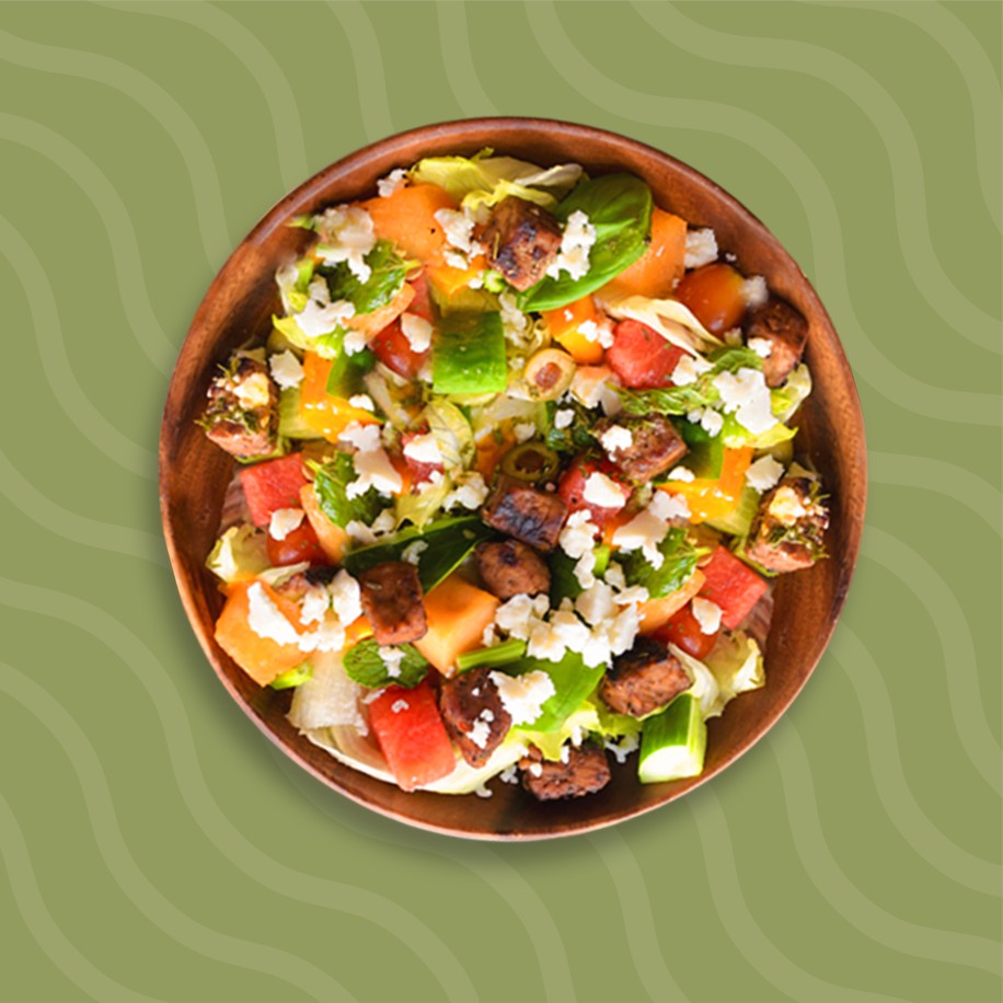Take a serving plate/bowl create a base using lettuce, add veggies of your choice, basil and mint leaves, pan tossed tempayy and drizzle the prepared dressing on it