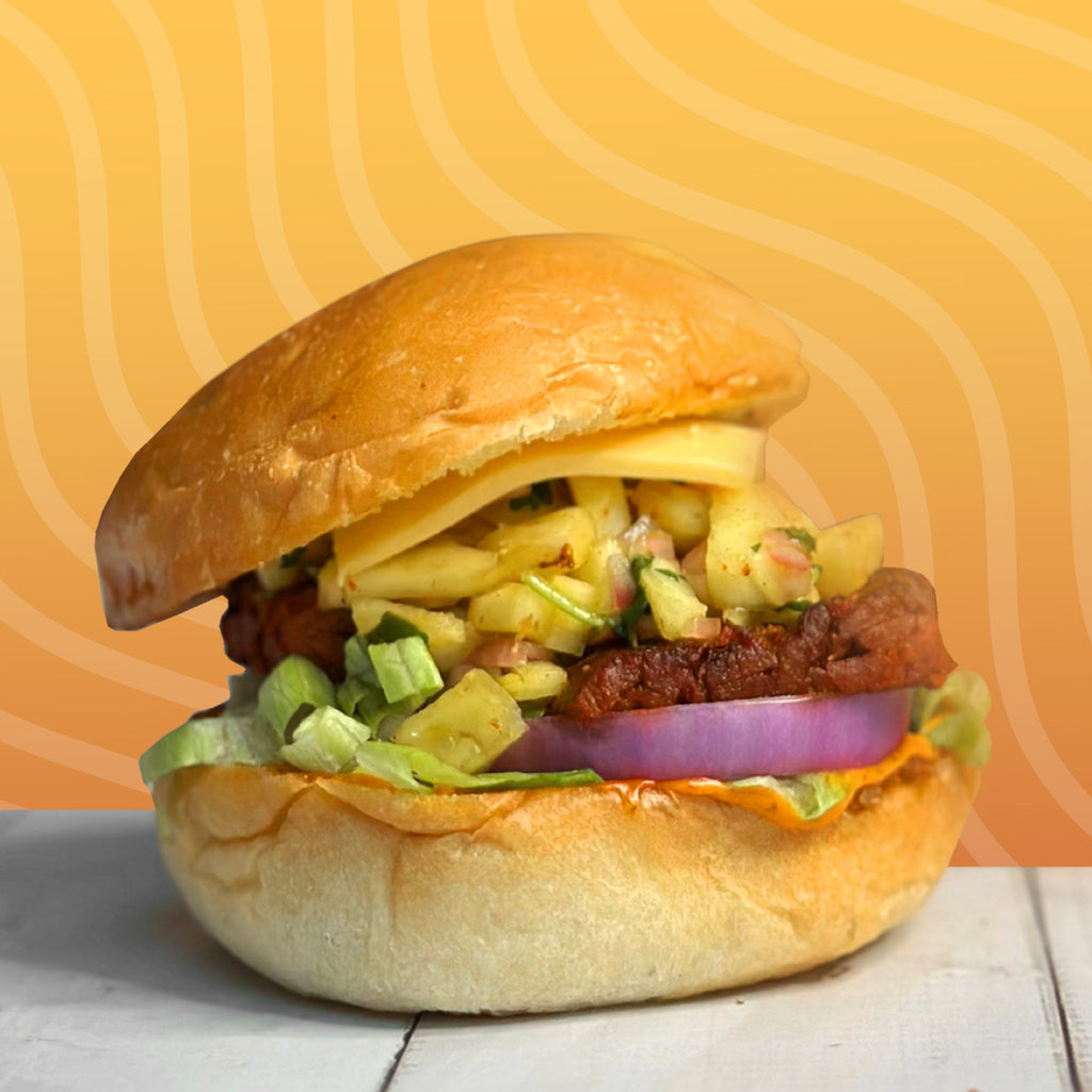 Spread a generous layer of tandoori mayonnaise on the buns. Add a layer of chopped lettuce, 2 onion rings, and 2 Thai Chilli Tempayy Thins. Top with a spoonful of pineapple salsa and a slice of cheese. Close the bun and enjoy!