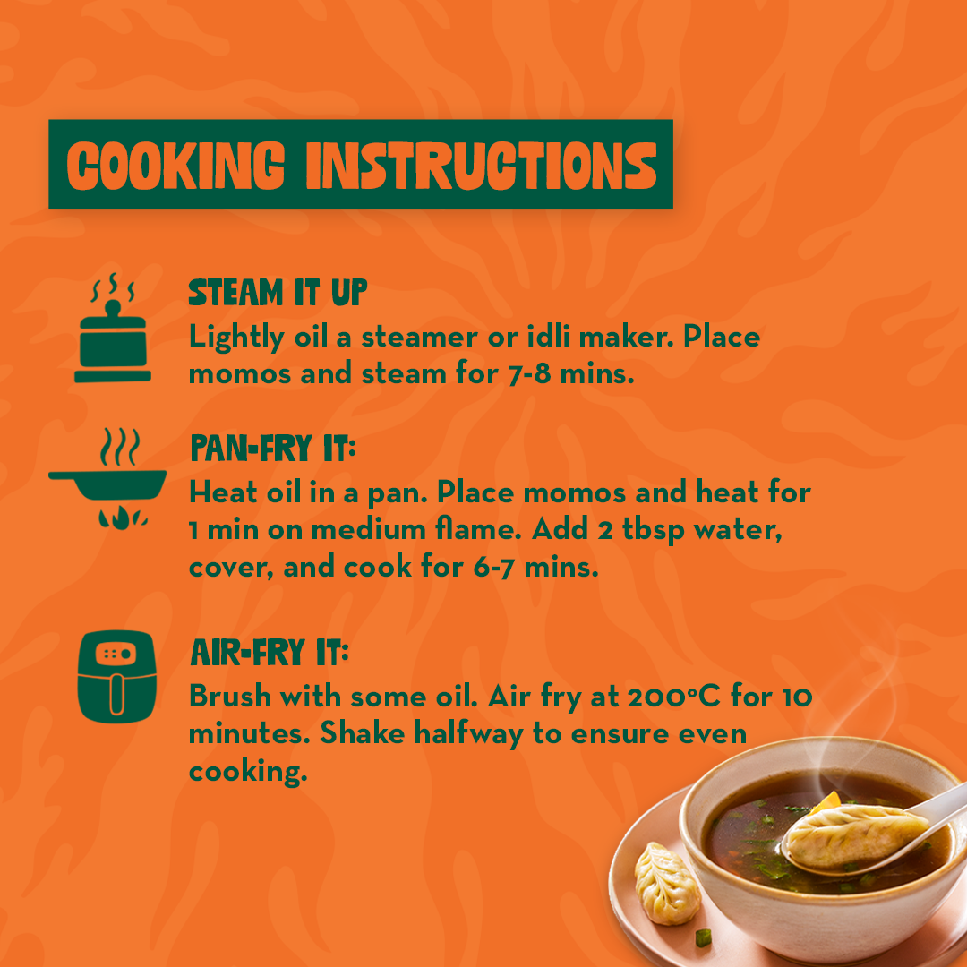 Pan-fry: Heat oil in a pan. Place momos and heat for 1 min on medium flame. Add 2 tbsp water, cover, and cook for 6-7 mins.