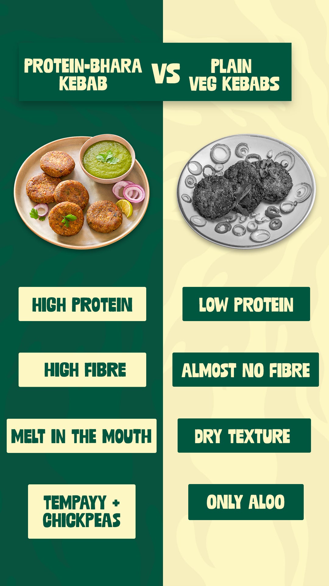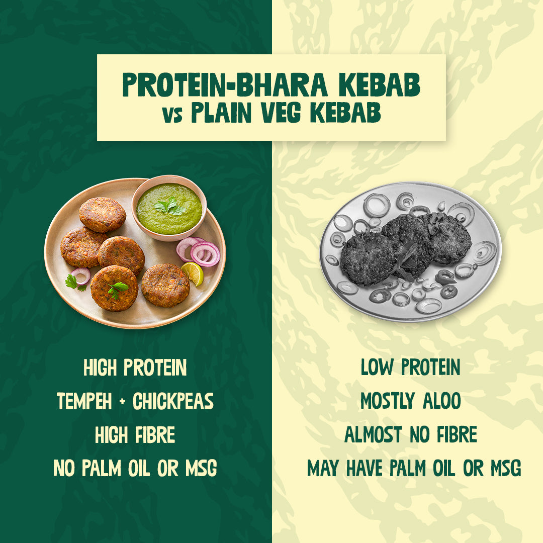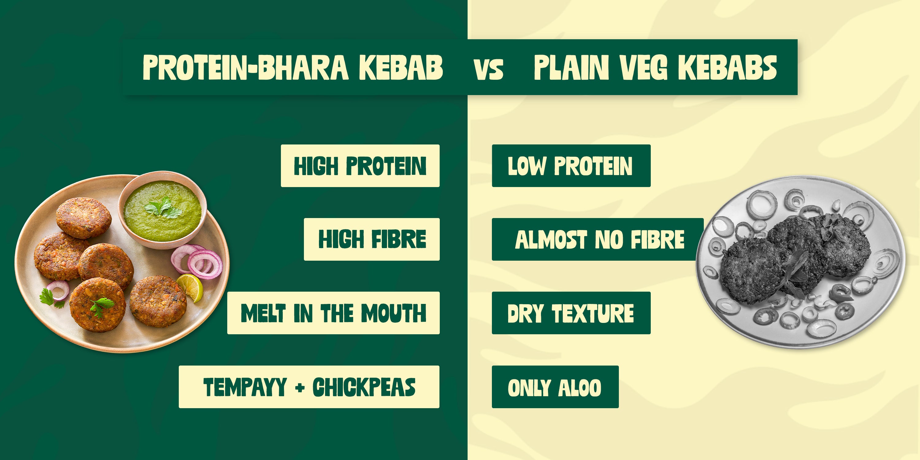 Most veg kebabs taste great… until you realise they’re basically just aloo and breadcrumbs. Low on protein, low on bite.