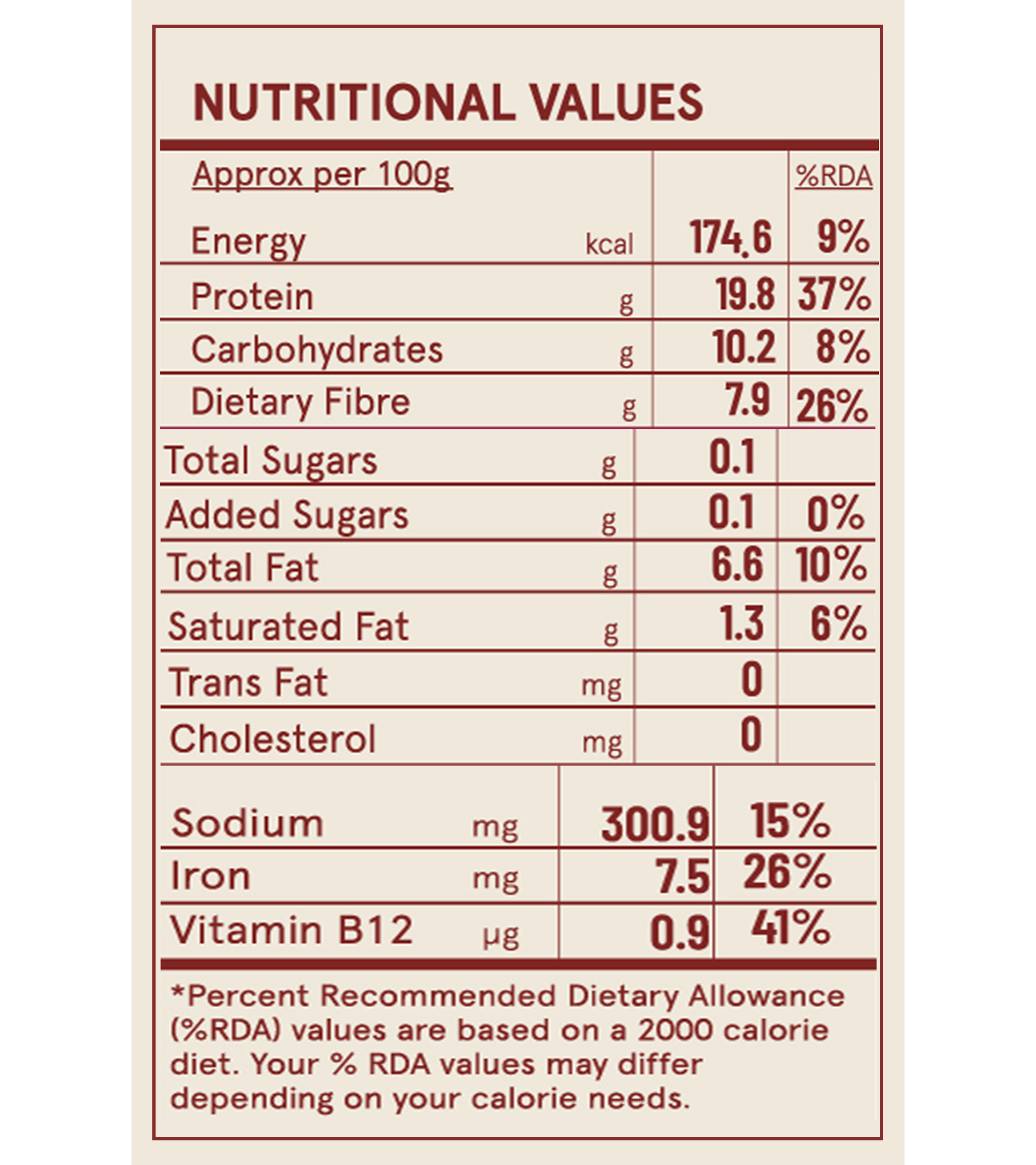 Non-GMO Soybeans, Water, Red Chillies, Garlic, Ginger, Lemon Juice, Mustard Oil, Black Salt, Spices & Condiments, Sugar, Natural Paprika, Rhizopus, Iron, Vitamin B-12